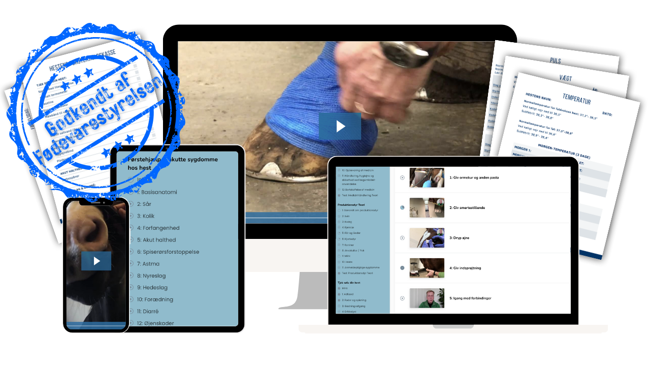 Med “Medicinhåndteringskurset: Pas bedre på din hest” får du både den lovpligtige uddannelse godkendt af Fødevarestyrelsen og et komplet opslagsværk i hestens sundhed. Du lærer trin for trin at tjekke din hest, forebygge sygdomme, yde førstehjælp og håndtere medicin korrekt og lovligt – og du afslutter med en praktisk lektion hos en hestedyrlæge, så du er fuldt klædt på både i teori og praksis. Du opnår ro i maven, færre dyrlægeregninger og vigtigst af alt: